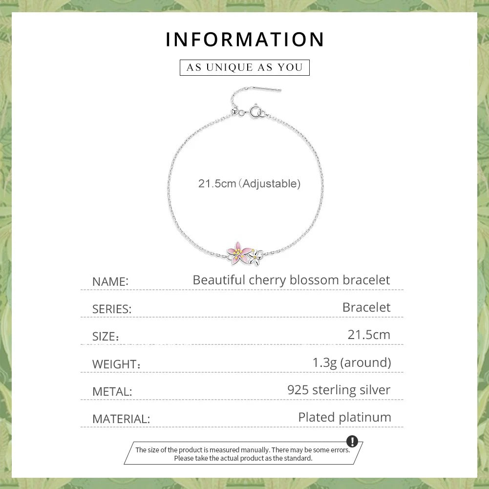 ❤ Description The bracelet with two cherry blossoms uses exquisite oxidation silver and enamel craftsmanship. fashionable and lovely. Pink cherry blossoms meet your girly heart.